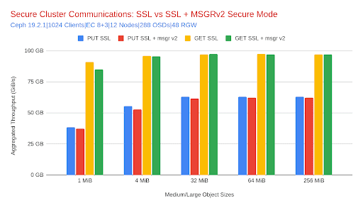 We evaluated the throughput and latency of GET and PUT operations across configurations with and without Messenger v2 security enabled. As shown in the graph and table below, the performance delta was negligible for both read and write operations, demonstrating that internal encryption in transit is compatible with high-throughput object storage use cases.