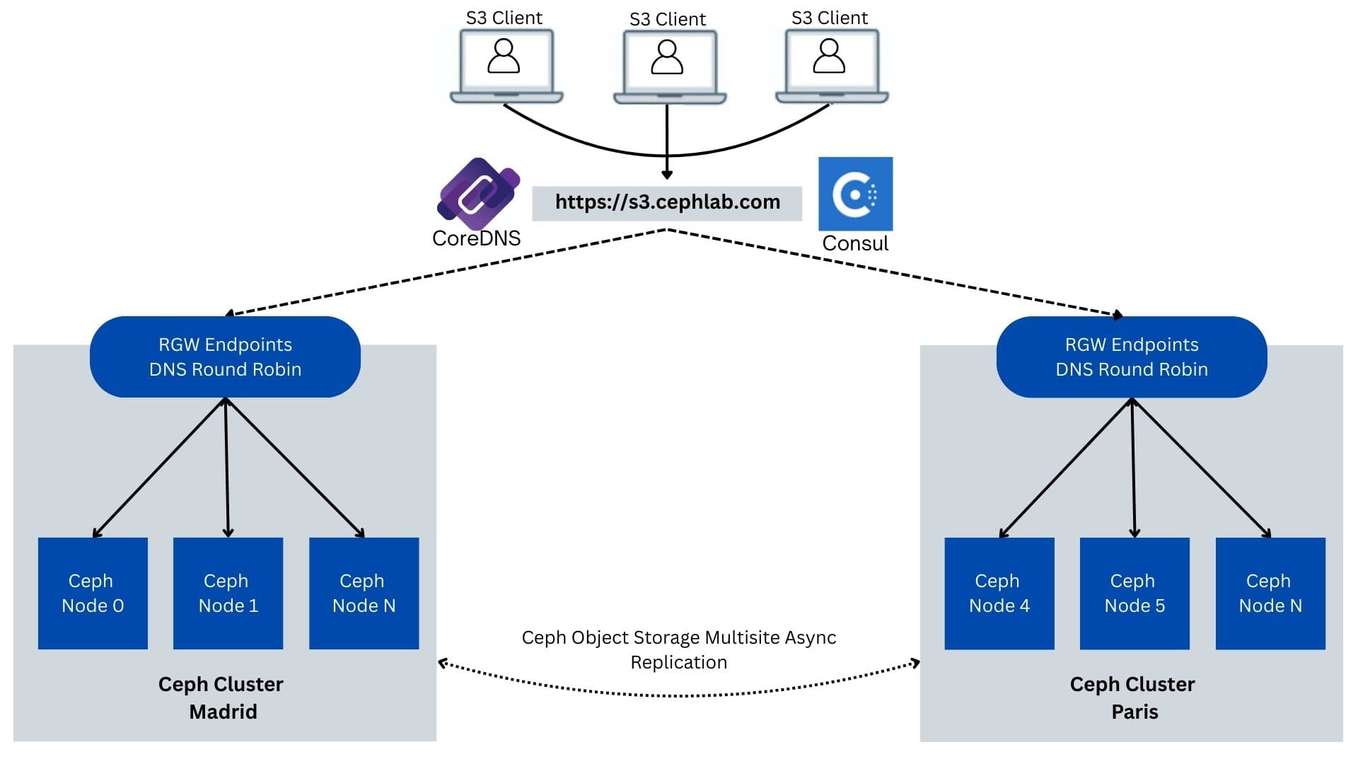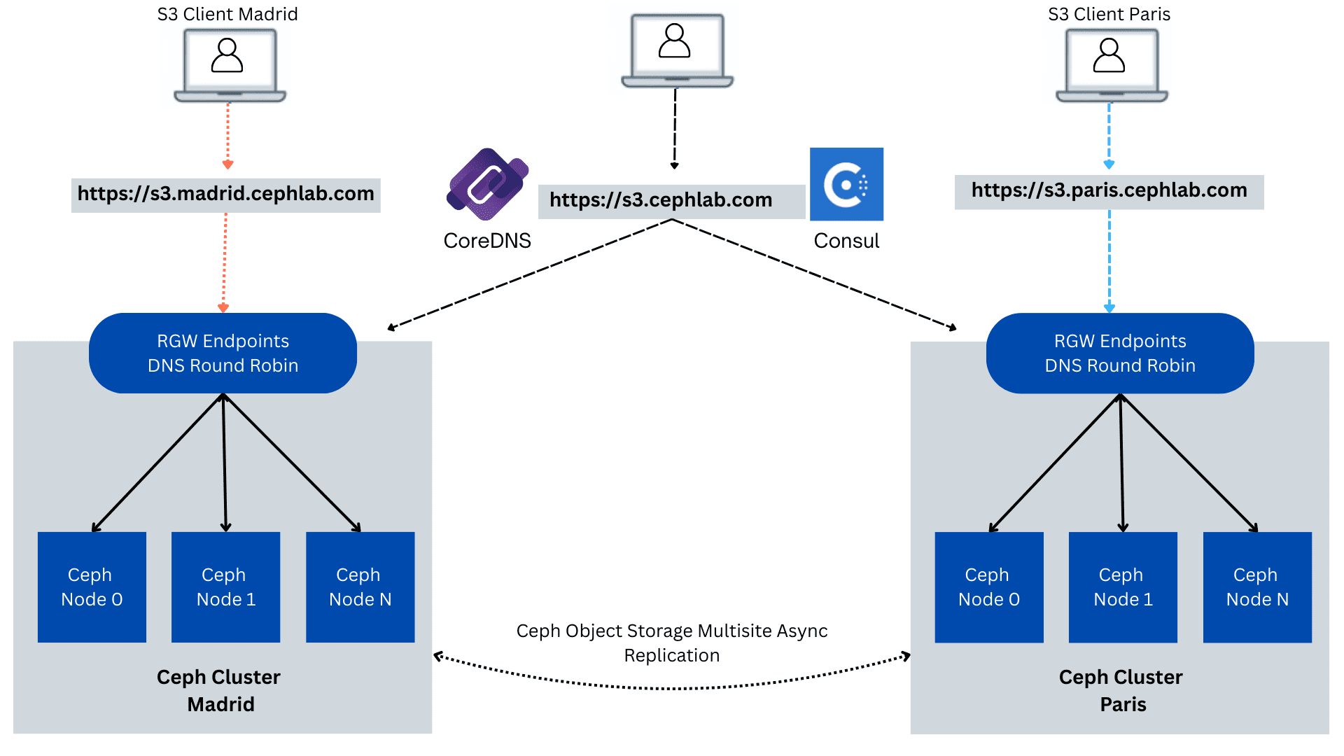 Next, in part 4, we’ll turn the Consul policy into a standard DNS experience. By running CoreDNS redundantly in each site (three per DC), the global name s3.cephlab.com always resolves to a healthy, nearby ingress by default. It automatically shifts to the other site if the local gateways aren’t available. We’ll also keep pinned per-site names (s3.madrid.cephlab.com, s3.paris.cephlab.com) for deterministic routing when needed (testing, compliance, troubleshooting).