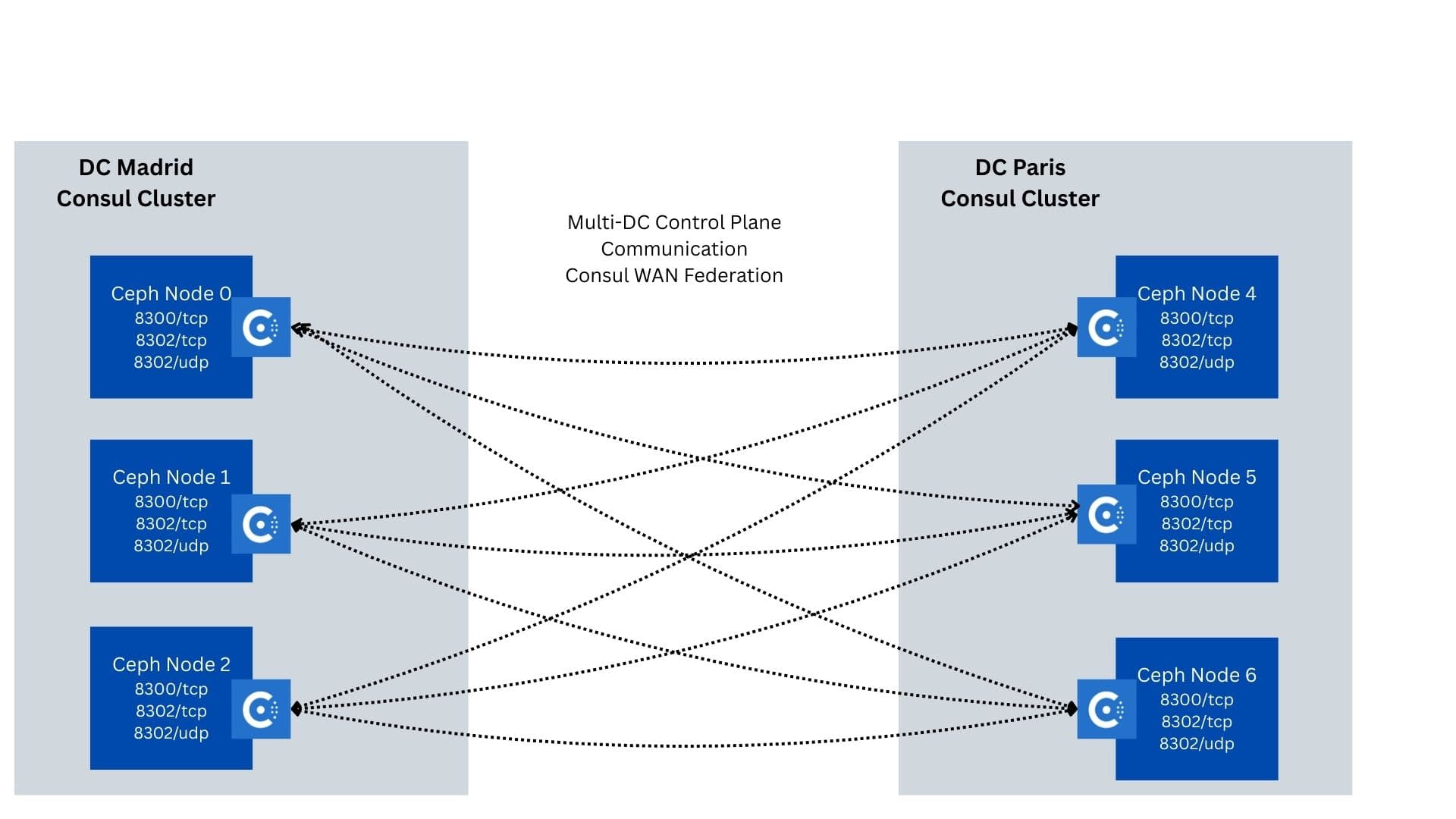 We now have a global control plane for the Ceph Object Gateway that stays true to data center boundaries: two independent Consul datacenters (Madrid, Paris) federated over the WAN, and a single prepared query (s3) defined in both. The query encodes our GLB policy, prefers local healthy ingress, and fails over to the peer only when necessary. We proved it works by executing it via the HTTP API and over Consul DNS on TCP port 8600. With this in place, the heavy lifting of "who should serve this request?" is solved without touching application URLs or centralizing state.