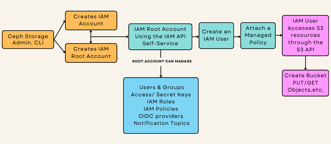 - IAM Root Account User: The admin responsible for the Account. Manages Resources within a specific tenant/IAM account, consuming the IAM API available through the RGW endpoint.