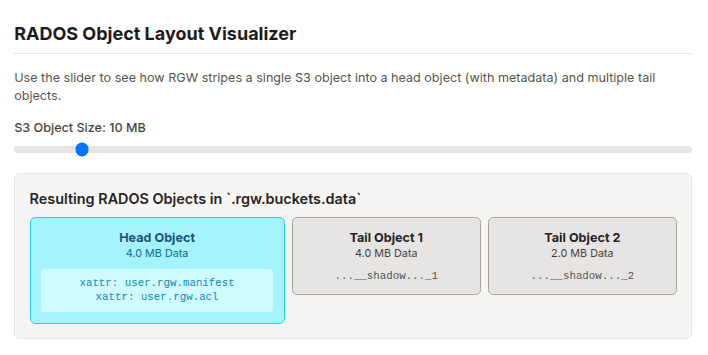 A single logical S3 object often consists of several physical RADOS objects. RGW employs a flexible head/tail object model that enables optimizations for various file sizes and complex operations including MultiPart Upload (MPU).