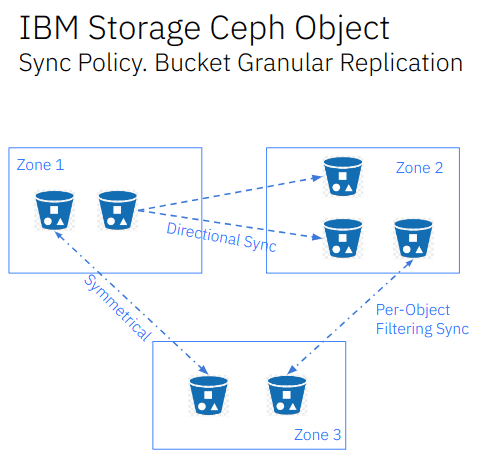 In Ceph releases beginning with Quincy, Ceph Object Storage provides granular bucket-level replication, unlocking many valuable features. Users can enable or disable sync per individual bucket, enabling precise control over replication workflows. This empowers full-zone replication while opting out of the replication of specific buckets, replicating a single source bucket to multi-destination buckets, and implementing symmetrical and directional data flow configurations. The following diagram shows an example of the sync policy feature in action: