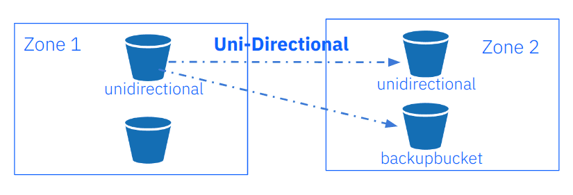 In this example we are going to modify the previous unidirectional sync policy by adding a new replication target bucket named backupbucket. Once we set the sync policy, every object uploaded to bucket unidirectional in zone1 will be replicated to buckets unidirectional and backupbucket in zone2.