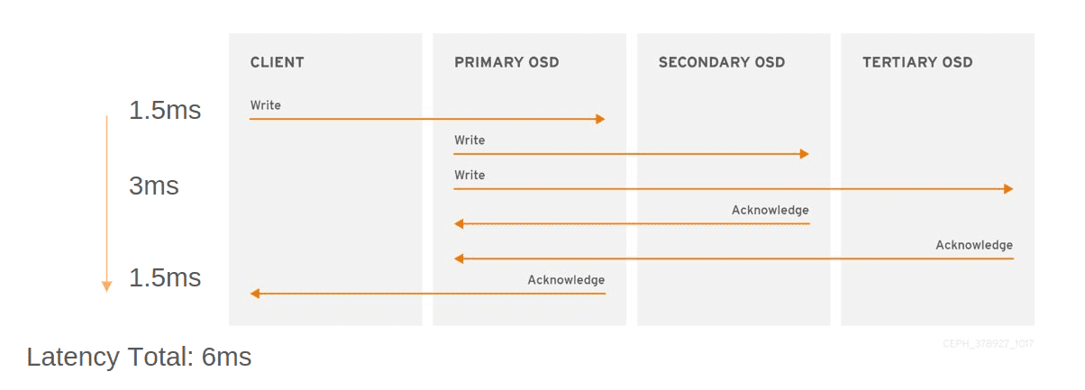 Performance: Each client write will experience at least the latency the of the highest RTT between sites. The following diagram shows operation latency for a three-site stretch cluster with a 1.5ms RTT between sites, with a client and primary OSD at different sites: