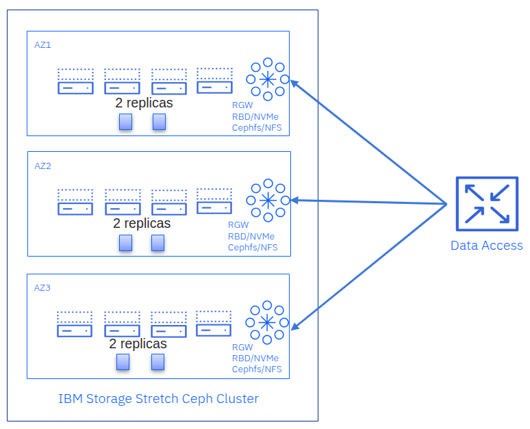 Each data center (or availability zone) houses a share of the OSDs in a three-site stretch cluster. Two data replicas are stored in each zone, so the CRUSH pool's size parameter is 6. This allows the cluster to serve client operations with zero data unavailability or loss when an entire site goes offline. Some highlights are below: