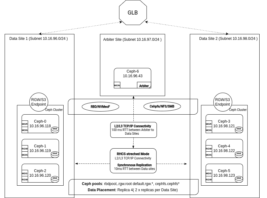 RGWs: Four RGW instances, two per data site, are recommended at minimum to ensure high availability for object storage from the remaining site in case of a site failure.