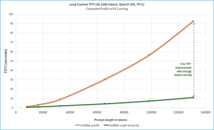 We wanted to characterize the reduction in time-to-first-token for a 100% cache hit rate from remote storage with Ceph across various context lengths, and chart it relative to computational prefill. For this we selected the LMCache long_doc_qa.py. We developed the following methodology for TTFT data collection:
