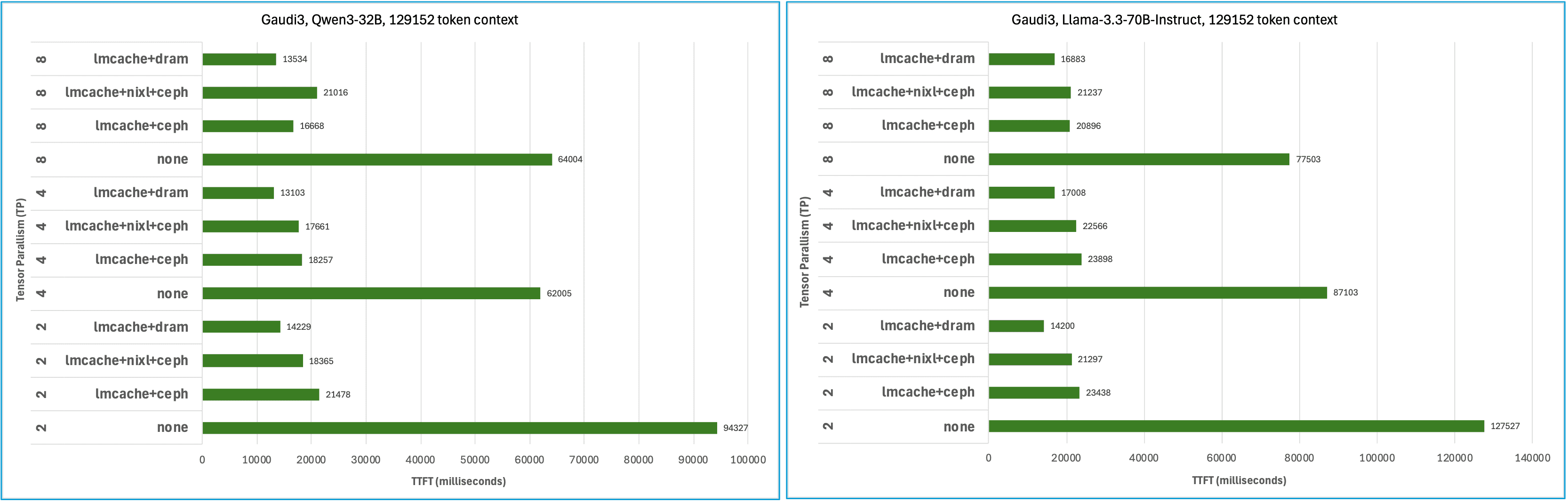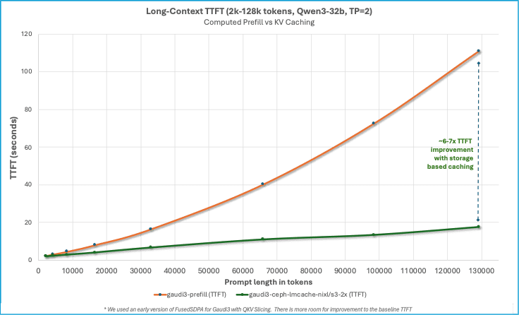 Considerable reduction in TTFT with both Intel Guadi3 and AMD MI300X accelerators, with the largest measured speed-up of 23x reduction. This testing also illustrates how KV caching can reduce TTFT more than using tensor parallelism to spread prefill across multiple GPUs in a system and that combing these techniques can deliver the lowest TTFT. It’s also worth pointing out that in addition to reducing TTFT, prefix caching derives additional value by conserving GPU cycles for decode – potentially reducing time-per-output-token (TPOT).